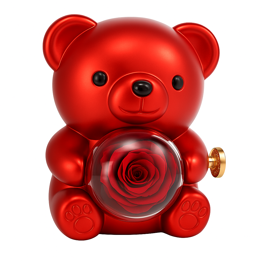 Czerwony Miś GiftBox™ to coś więcej niż zwykłe opakowanie prezentowe — to emocje zamknięte w formie uroczego misia, który trzyma elegancką różę i skrywa miejsce na pierścionek lub naszyjnik.